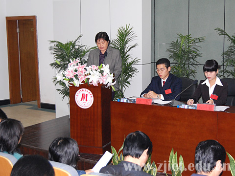 开幕式上,第十六届学院学生会副主席蒋美飞同学致了开幕词。学院党委副书记潘素芳代表学院党委作了讲话。她首先代表学院党委向大会的召开表示了热烈的祝贺,对给予我院学生会工作关心和帮助的兄弟院校来宾表示了诚挚的欢迎,同时也向全院广大青年学生致以亲切的问候。潘书记在讲话中充分肯定了一年来学院第十六届学生会做的工作和取得的成绩,指出了本次大会召开的特殊意义,并对广大青年学生提出了三点要求。一是树立坚定的理想信念,真正成为广大学生的先进典范。二是弘扬全心全意为广大学生服务的理念,从学生中来,到学生中去。三是紧紧围绕学院的中心工作,积极开拓,锐意进取。希望他们能够真正的把大会的精神带到广大同学中去,践行“三个代表”重要思想,贯彻党的十七大精神,落实科学发展观,践行“厚德崇商”的校训,勤奋学习,努力工作,为学院发展作出更大贡献。