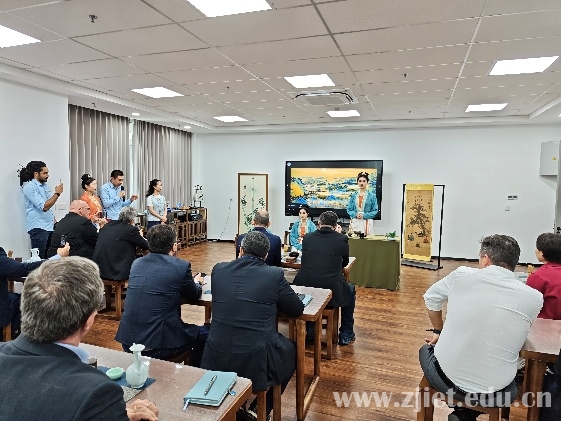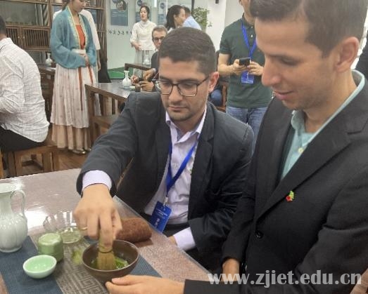 在文化体验环节,巴西学员与浙经贸师生代表共同进行了一场别开生面的跨文化对话。“宋代点茶”这场文化交融的盛宴,架起了中巴合作的文化桥梁,从研膏碾茶的手作之趣,到茶百戏绘制的东方美学,学员们在执盏点茶的仪式感中,触摸中国茶文化的肌理脉络,体悟东方管理哲学中的治理智慧。